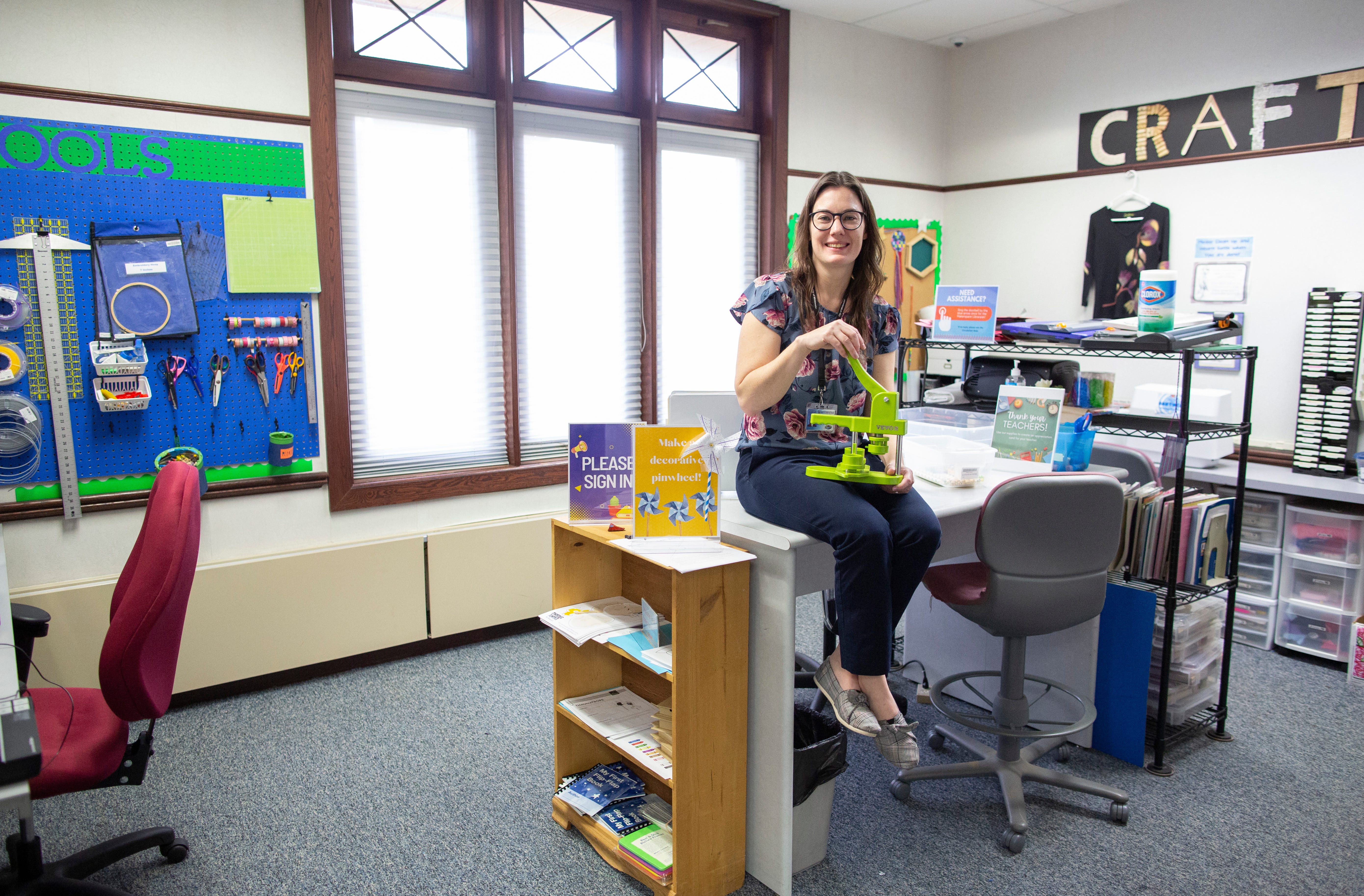 While the library’s makerspace has existed for a relatively long time, it took a while for the library to determine – and fund – a staffing model to support the community’s use of the makerspace. The role of Programming and Makerspace Librarian grew from a part-time to a full-time position just as the pandemic hit in 2020. The person hired initially soon left to take a position closer to home, leaving an opportunity for Sarah French, a working artist with lots of programming experience in libraries, to step into a role that unites her creativity and her love for human connection.